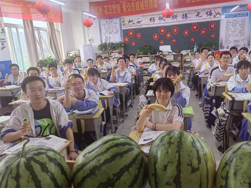 6月3日傍晚,我校为高三全体师生紧张的备考学习送上一份清凉与香甜。赠送西瓜、香蕉等水果,寓意考试顺利,红红火火,助力高考腾飞。一个个瓜熟脆甜的大西瓜,在炎炎夏日为大家带来清凉,甜甜的西瓜也带来老师们甜甜的祝福,希望同学们放下焦虑和担忧,平心静气备考,好运连连。