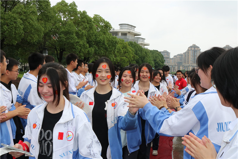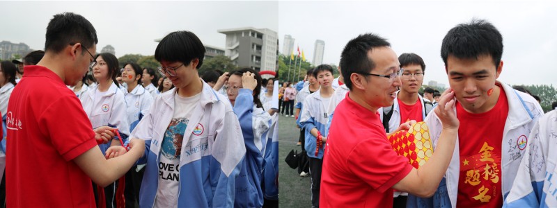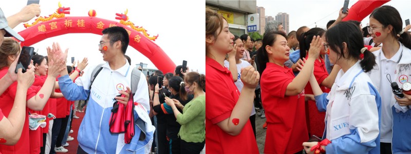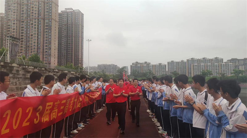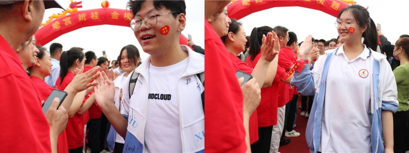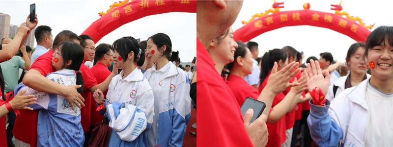 战斗的号角已经吹响,勇士的征帆即将起航。高一高二的同学们排成两列为学长们加油助威。红色的“成功门”高高挺立,陪伴三年的老师们等候在旁,为同学们壮行。在振奋人心的鼓声和加油声中,在领导和老师们的祝福鼓励声中,高三学子信心满满,迈着坚定有力的步伐跨出校门。