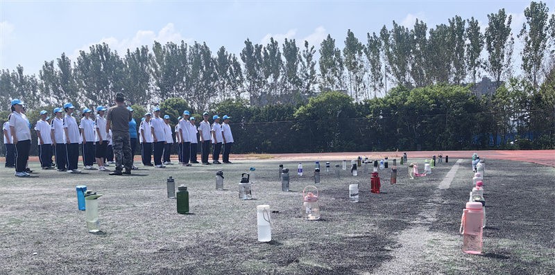 一旁整齐排列的水杯,与两旁整齐划一的动作交相呼应,成为了训练场上一道独特的风景线。这都是他们纪律严明、意志坚毅的体现。