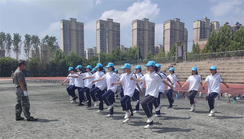 开营仪式结束后,各个班级的教官们带领学生在各自训练场地开始正式训练。“一二一,踏步走”,整齐的脚步声伴着高昂的口号声,同学们目光坚定、动作有力。豆大的汗水从脖颈上滑落,稚嫩脸庞在炎炎烈日下尽显刚强。
