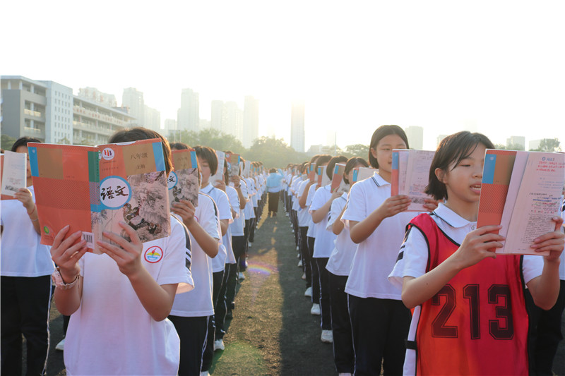 操场上,全体学生列队集合,迅速进入操前小读状态。他们站姿标准,持书整齐规范,昂首挺胸,声音洪亮。