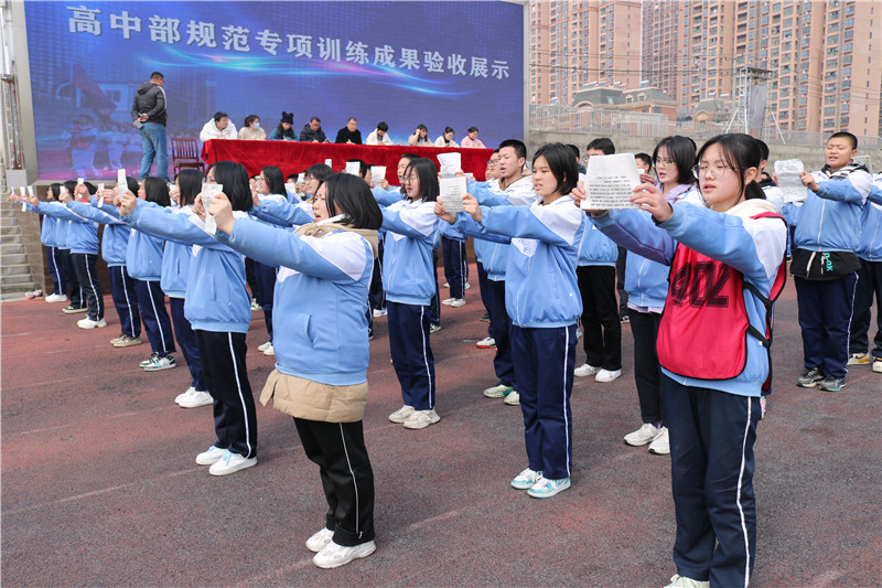 为培养学生良好的学习和生活习惯,构建良好的校风,本月我校高中部开展了激情、班风、内务、环境、卫生、静文化、课堂、礼仪等一系列学生行为习惯养成教育训练,并取得了良好的成效。下面就跟随镜头,一起看看训练的验收成果吧!