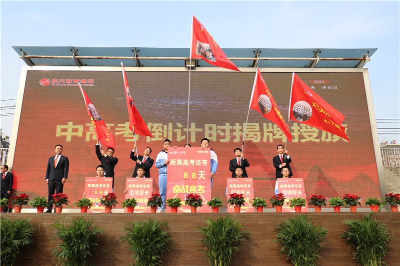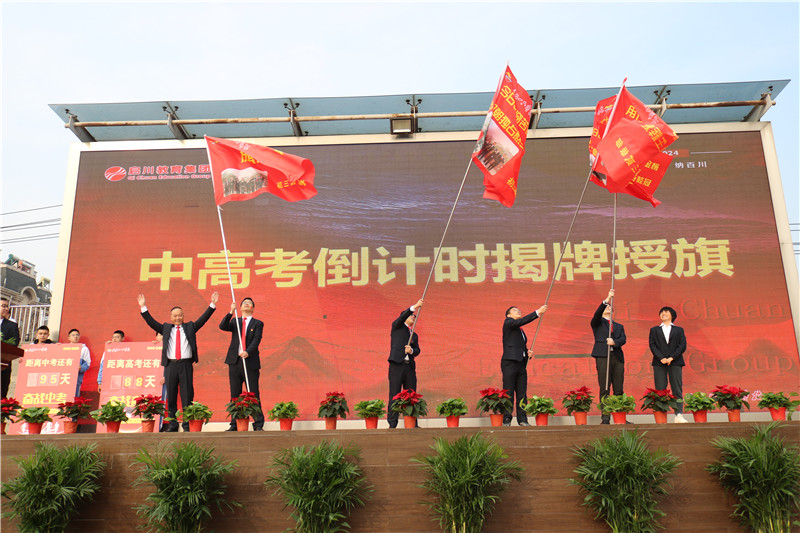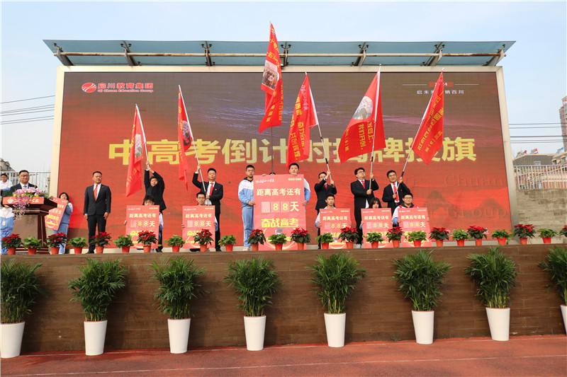 吴校长向高三年级各班授高考倒计时牌和战旗。