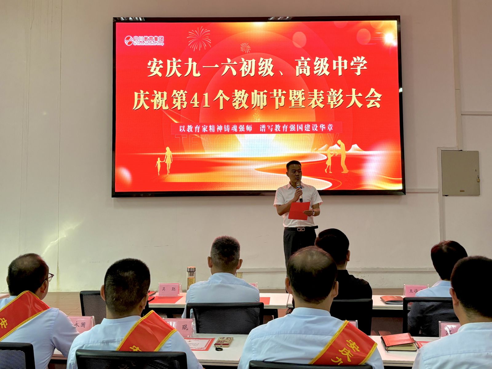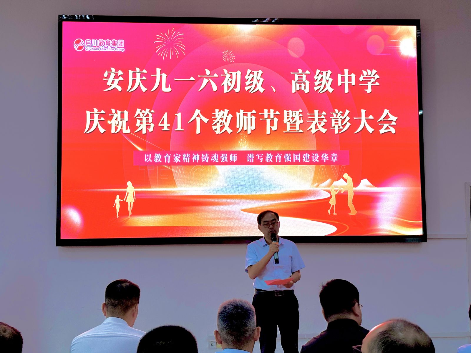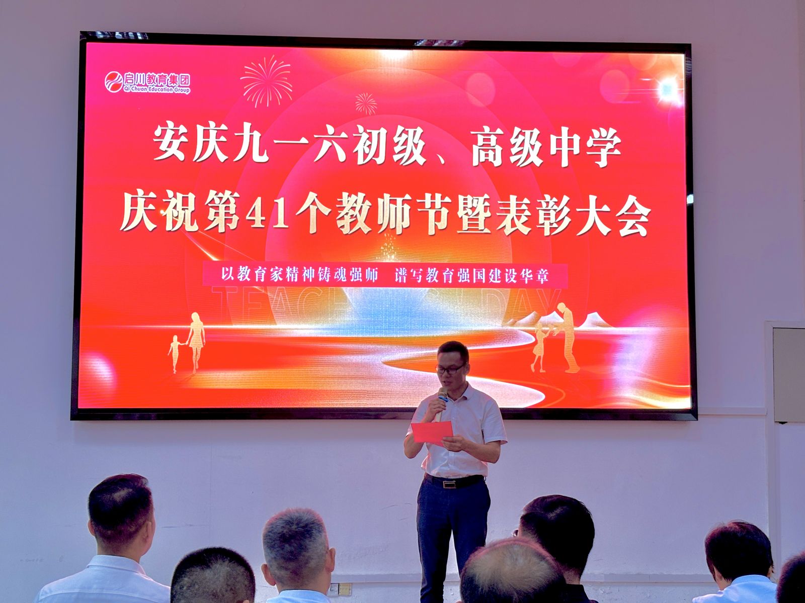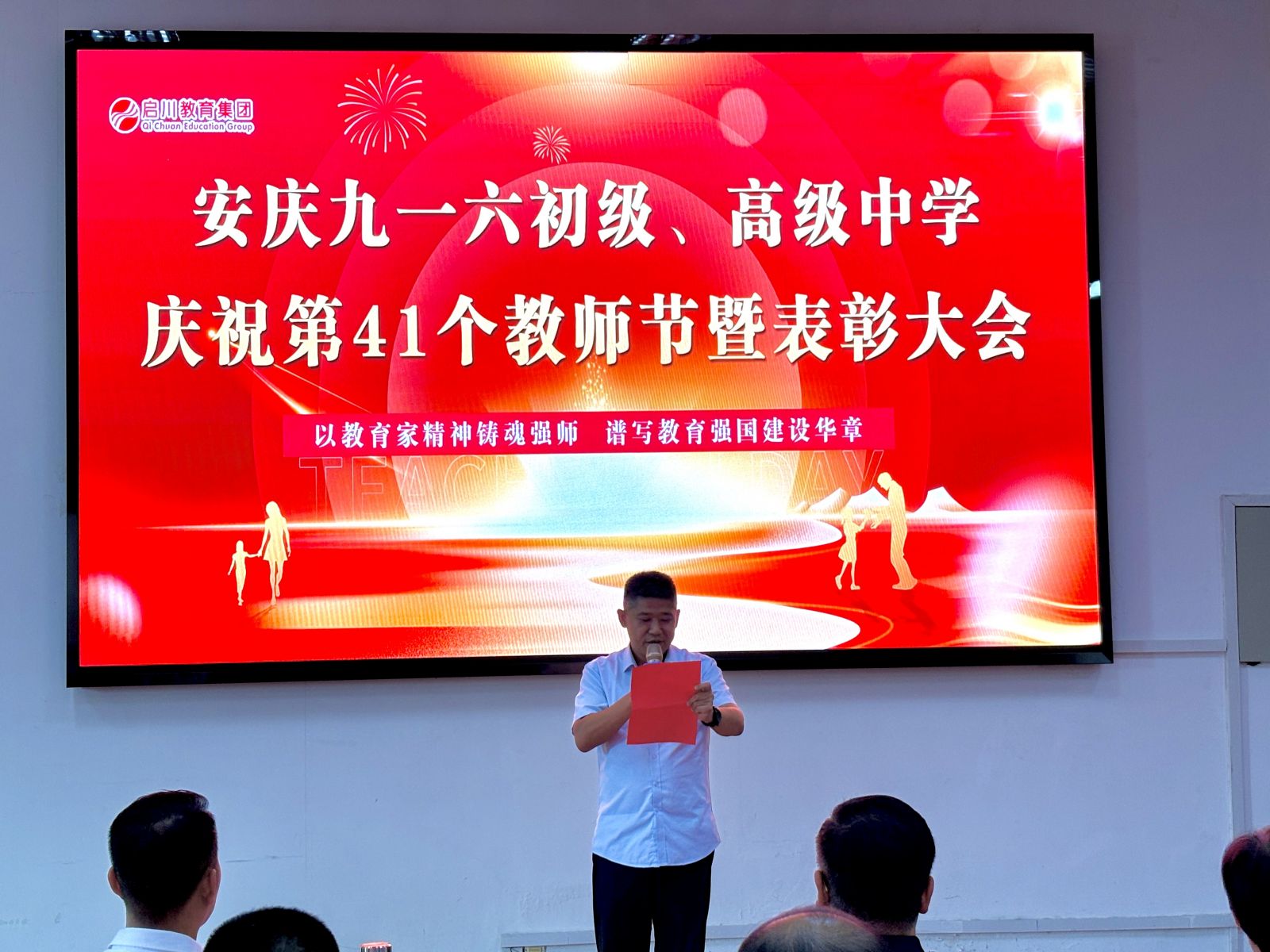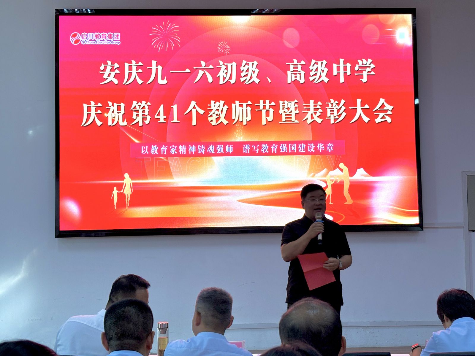 随后,齐校长传达了董事长程启川先生致全体教职工的节日贺词。贺词中弘扬“教育家精神”,这是多次被提及的概念,它并非遥不可及,而是体现在日常教学的点点滴滴中。这是一份融合了敬意、期望、承诺与战略的综合性发言,董事长既是对教师过去辛勤付出的肯定,更是对未来教育方向的引领。总而言之,期望教师们在未来能成为心怀家国、德才兼备、拥抱创新、关爱学生的教育工作者,在变革的时代中坚守育人初心,携手共赴教育的新征程。