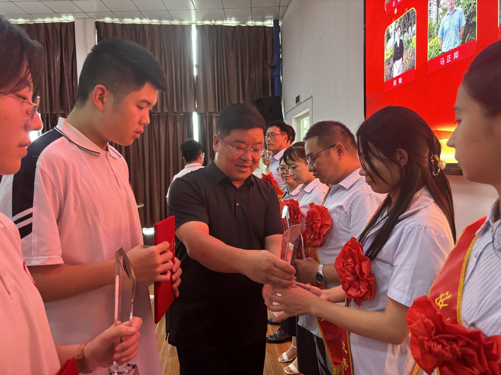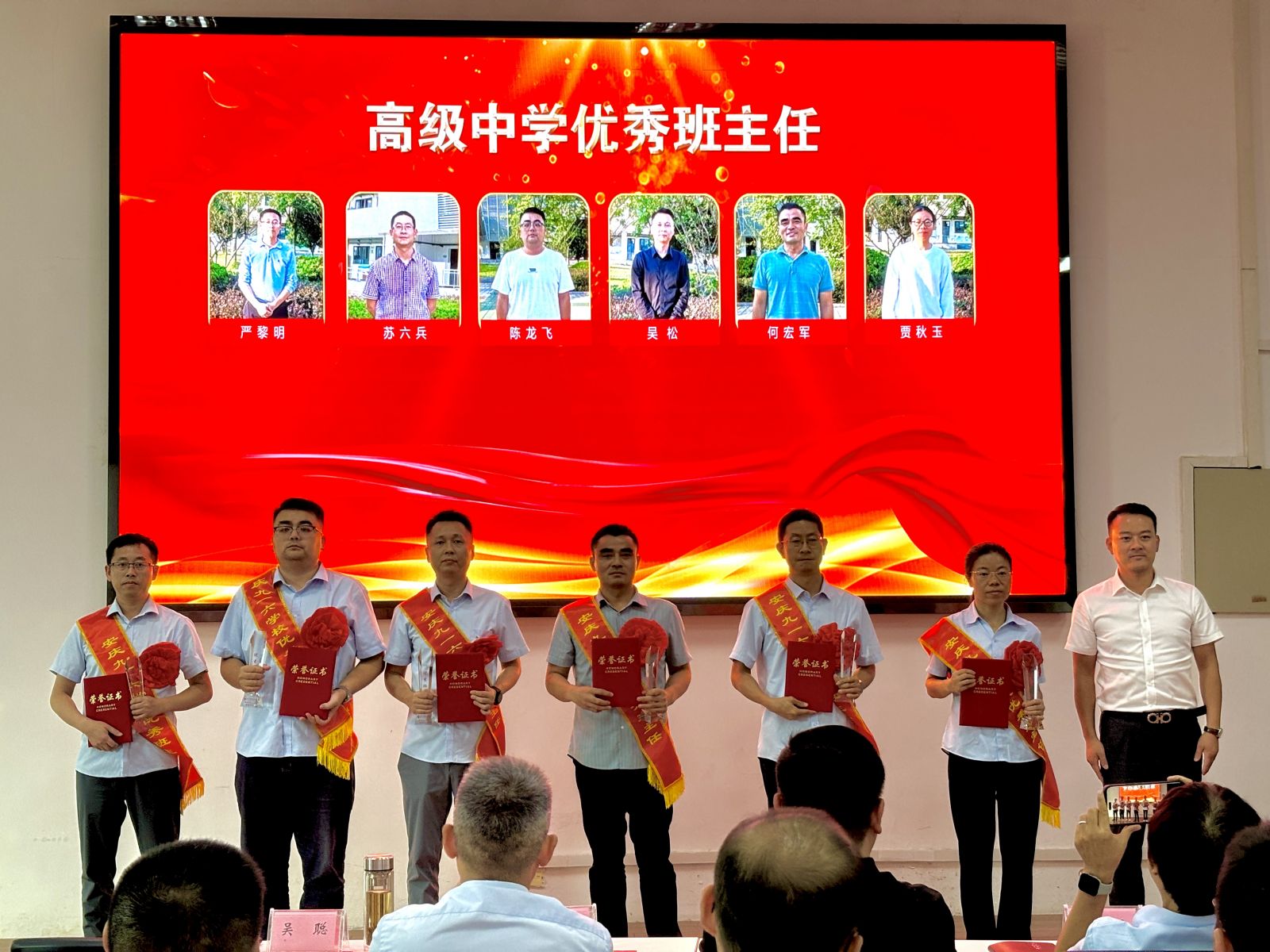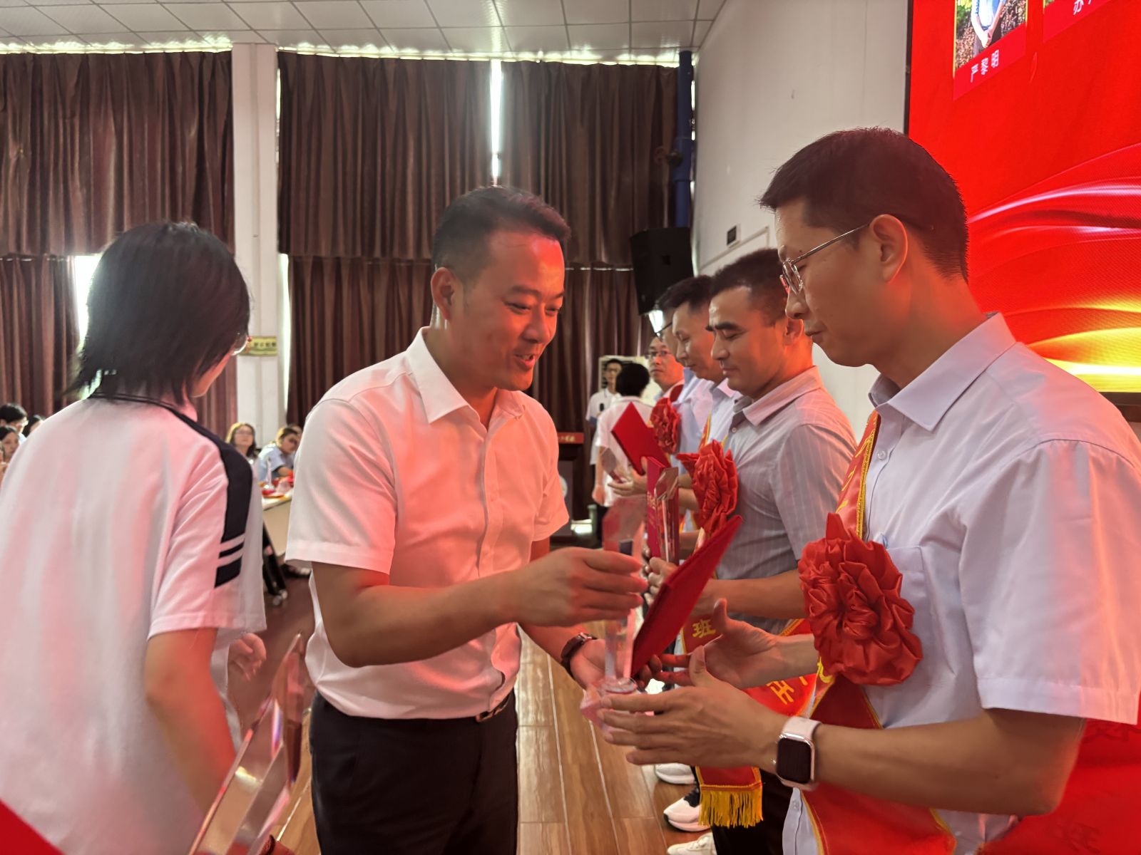 在热烈的掌声中,大会进入了隆重的表彰环节。学校领导先后宣读了“关于表彰2024-2025学年度优秀教师、优秀班主任、优秀备课组长、优秀员工和优秀级部主任的决定”。表彰环节,获奖教职工们依次上台领奖,校领导为他们颁发奖杯及证书并合影留念。