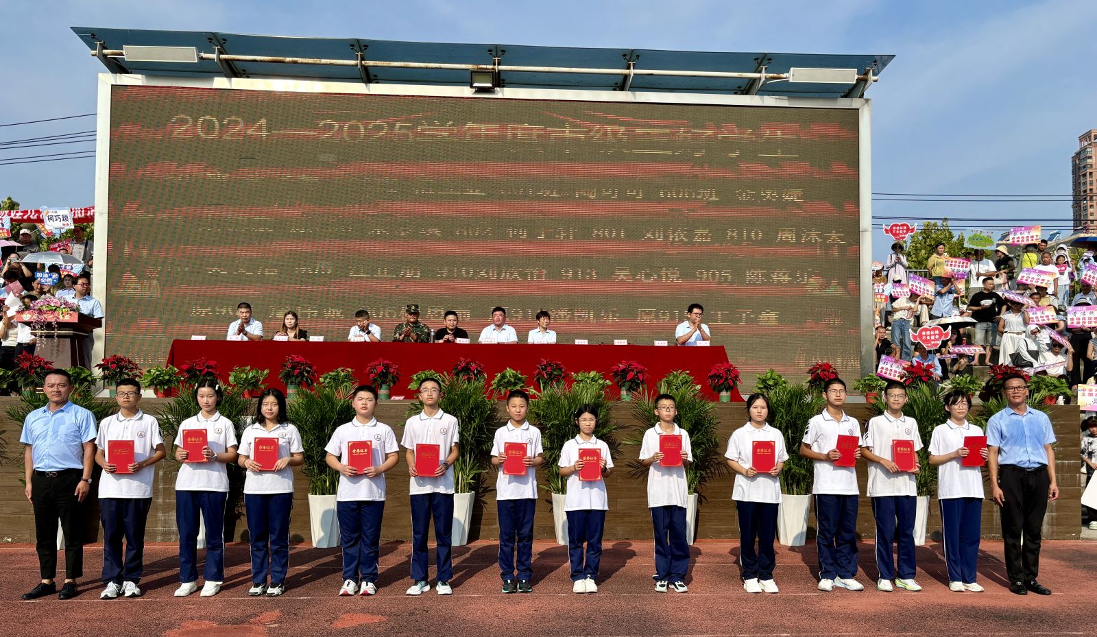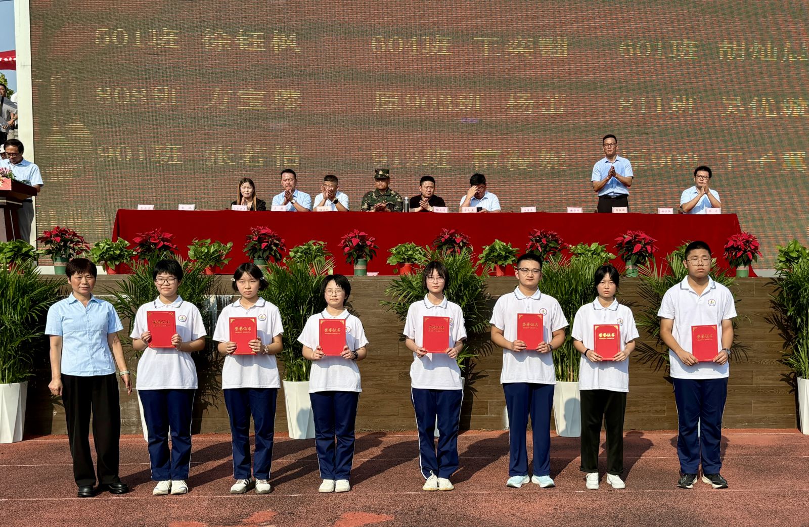 大屏幕上播放着教导员和同学们的合影。回望这段时光,教官们以钢铁般的意志和温暖的心灵,陪伴我们度过了每一个汗水与欢乐交织的瞬间,见证着我们的成长与蜕变。他们用汗水浇灌我们的坚韧,用智慧点亮我们的前行之路。虽然离别在即,但同学们会铭记教官的教诲,勇敢向前,在人生的战场上创造属于自己的辉煌。