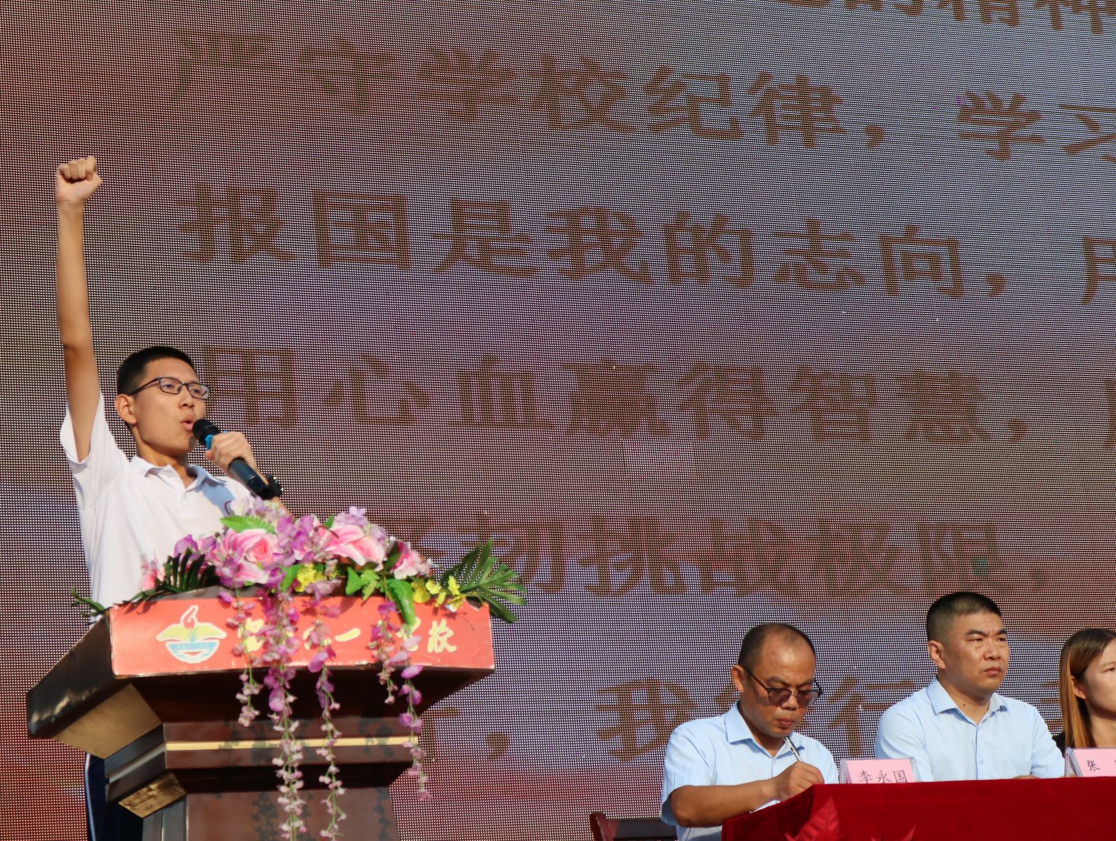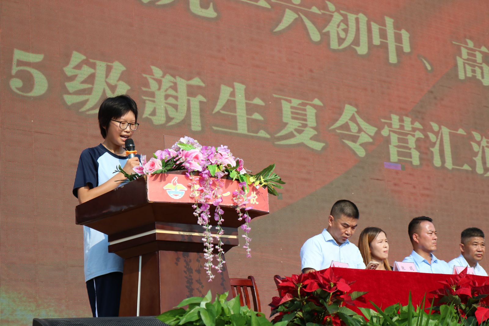 高一(5)班江俊珠同学代表新生发言。