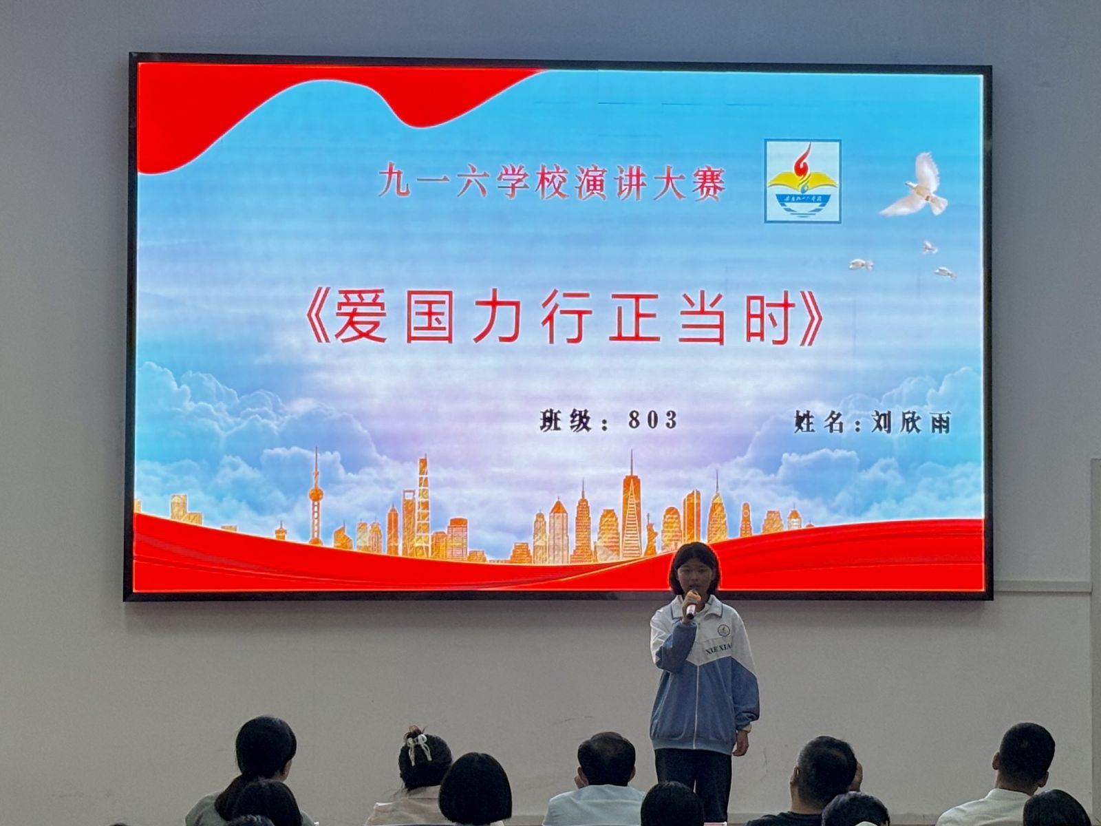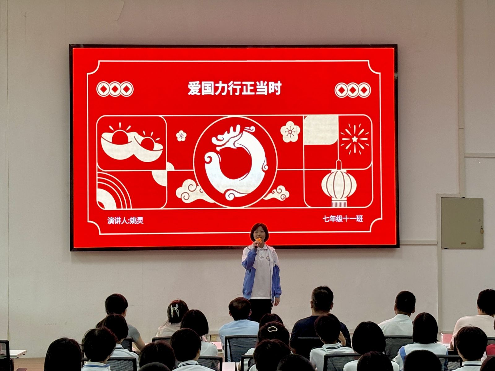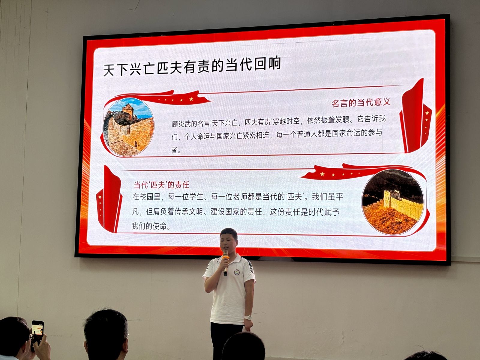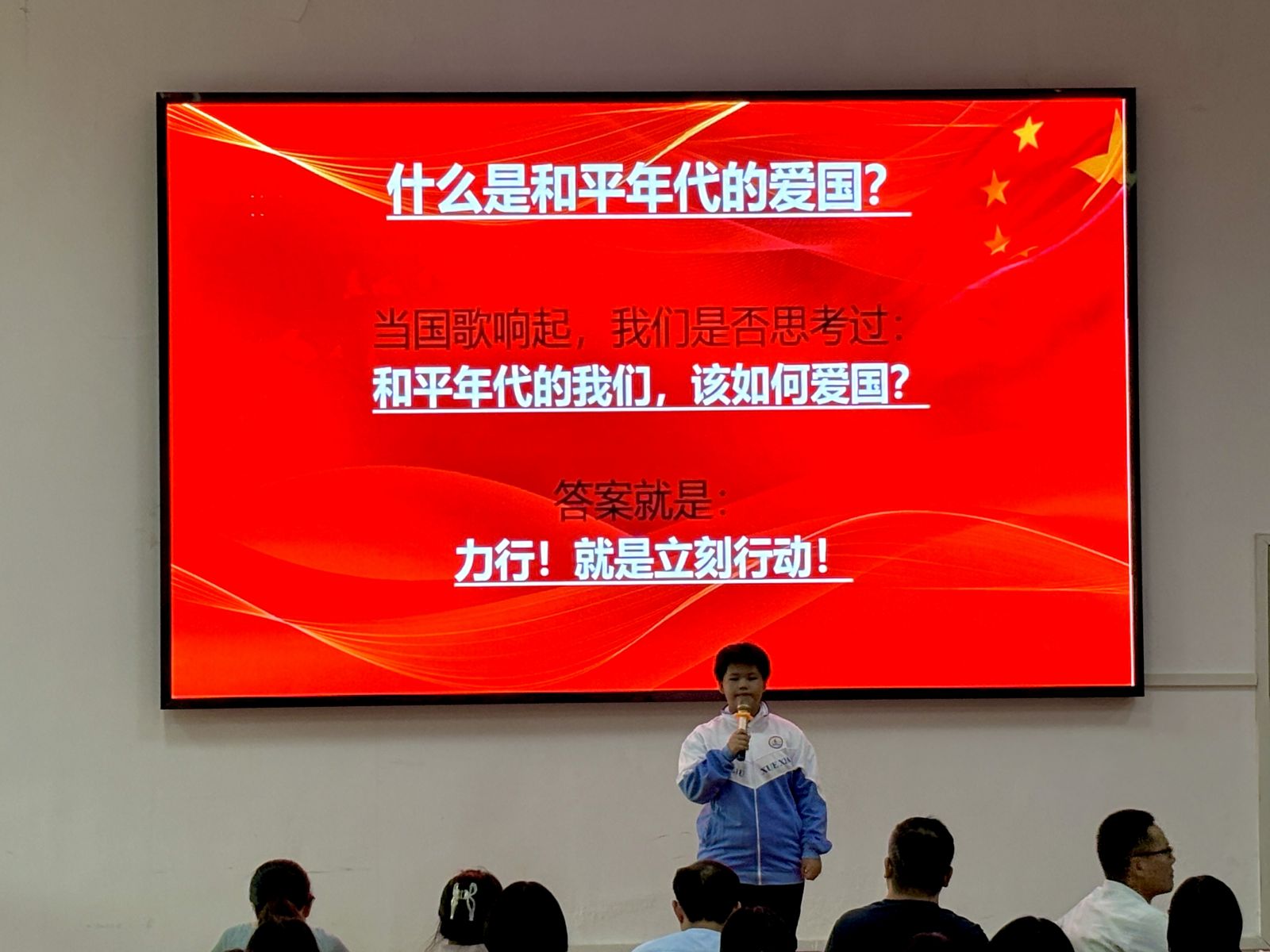 在认真聆听了学生的演讲后,徐校长发表了深情而有力的点评讲话,他对同学们的演讲给予了高度评价。他指出:“今天登台演讲的同学,不仅有‘家国天下’的宏大视野,更有‘起而行之’的务实精神。你们的思考有深度,情感有温度,行动有方向,让我看到了新时代青少年最美的样子。你们用实际行动证明了,‘力行’是爱国最有效的表达。”