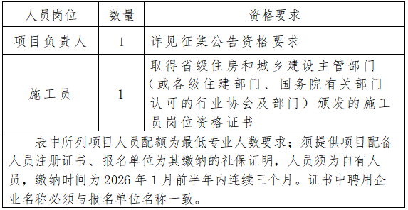 1、报名人资质要求:报名人具备住房城乡建设主管部门颁发的市政公用工程施工总承包三级及以上资质,具备有效的安全生产许可证,具备有效的营业执照,本次不接受联合体报名。